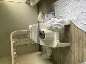 Ich verstehe, dass ich einen Einmalslip anziehen muss und eine Duschhaube aufsetzen muss. (Letzeres verstört mich ein wenig!)