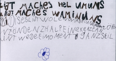 *lol* SO, genau so hat mein 'Kleiner' auch mal geschrieben, es seinem großen Bruder abgeguckt, nachgeahmt und es hat lange gedauert, bis er leserlich schrieb, noch weit bis ins gymnasiale eiten hinein. Aber das ist kein Grund, sich Sorgen zu machen (weißt du wahrscheinlich selbst). Inzwischen ist dieser Chaos-Schreiberling ein überaus erfolgreicher Student. Das wird schon :-))) - (Das 'Lehrerhasserbuch' existiert mfür mich einfach nicht ... Luft ... phhh ...)